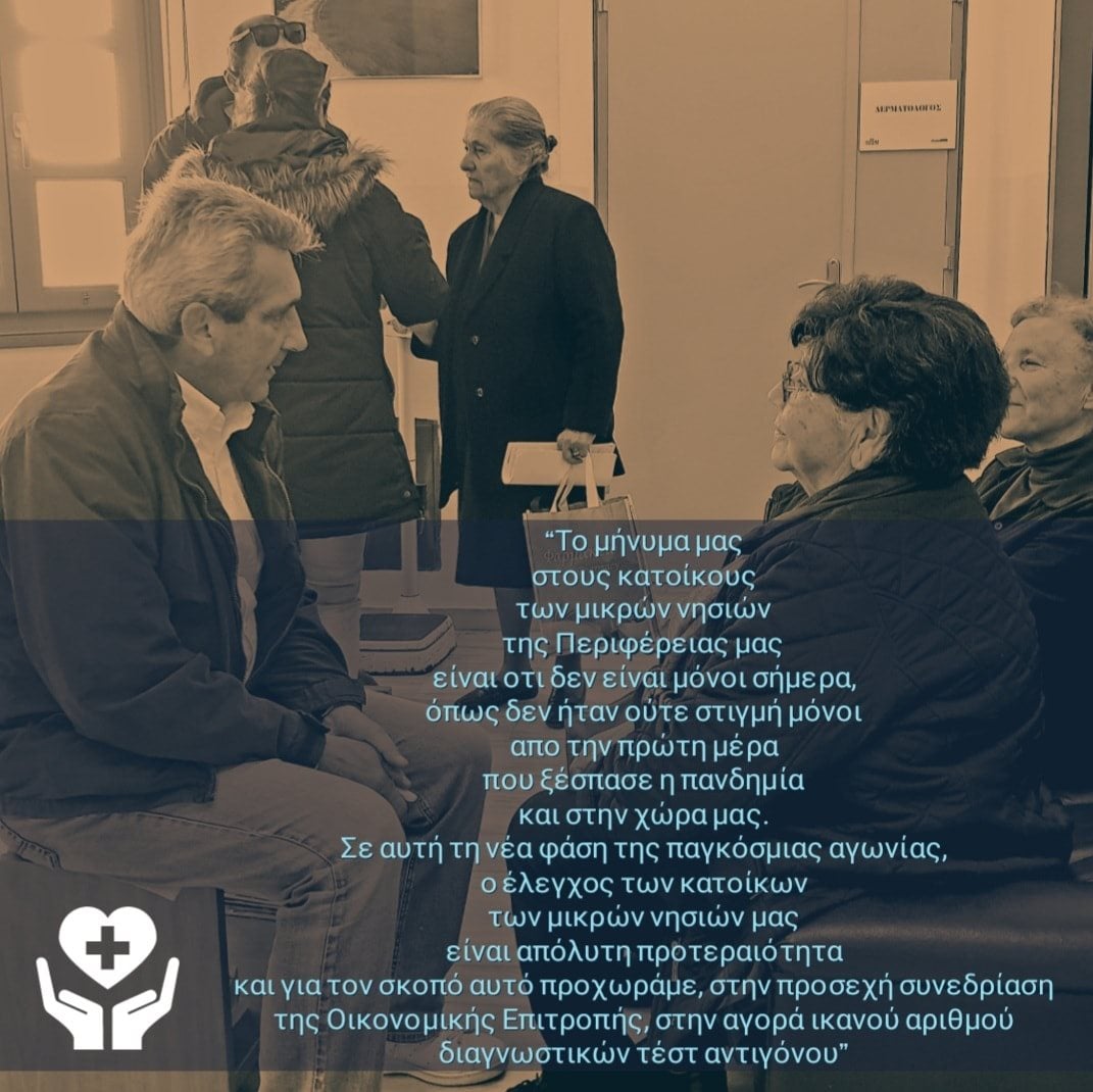 «Το μήνυμα μας στους κατοίκους των μικρών νησιών της Περιφέρειας μας, είναι ότι δεν είναι μόνοι σήμερα, όπως δεν ήταν ούτε στιγμή μόνοι από την πρώτη μέρα που ξέσπασε η πανδημία και στην χώρα μας. Γιατί, από την πρώτη περίοδο της πανδημίας, έχουμε καταργήσει κάθε όριο αρμοδιότητας, κάθε φυσικό ή τεχνητό εμπόδιο, προσπαθώντας να σταθούμε στο πλευρό τους με κάθε δυνατό τρόπο και χωρίς να υπολογίζουμε οικονομικό κόστος. Σε αυτή τη νέα φάση της παγκόσμιας αγωνίας, ο έλεγχος των κατοίκων των μικρών νησιών μας είναι απόλυτη προτεραιότητα και για τον σκοπό αυτό προχωράμε, στην προσεχή συνεδρίαση της Οικονομικής Επιτροπής, στην αγορά ικανού αριθμού διαγνωστικών τεστ αντιγόνου».