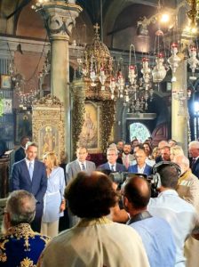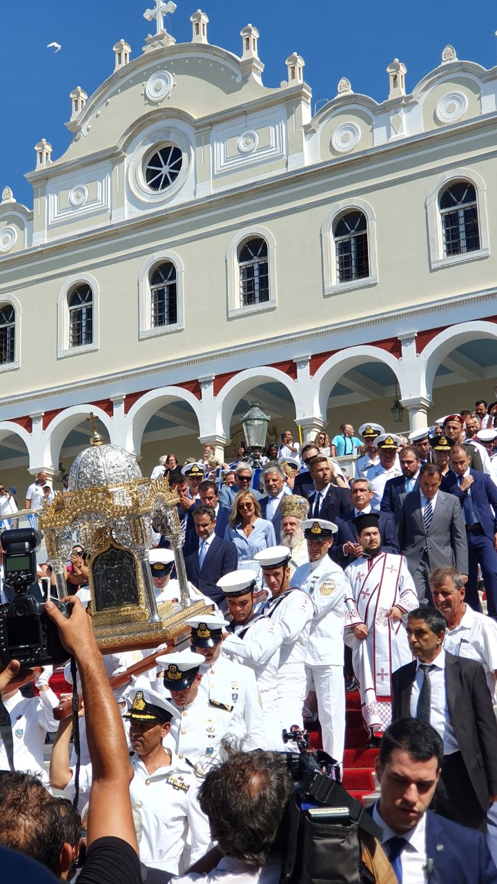 Στη συνέχεια, παρακολούθησαν την Αρχιερατική Θεία Λειτουργία, προεξάρχοντος του Σεβασμιωτάτου Μητροπολίτου Σύρου – Τήνου, Δωροθέου Β’ και ακολούθησαν τη λιτάνευση της Ιεράς Εικόνας της Μεγαλόχαρης μέχρι το λιμάνι του νησιού.